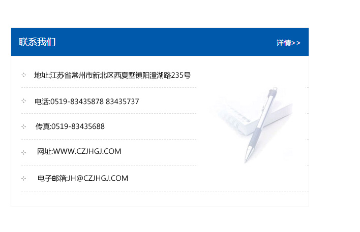 地址:常州市新北區友邦商務大廈1幢16、17層  電話:0519-85101652  傳真:0519-85112595  郵編:213022  網址:www.cz-jiayue_cn.fsbhbyfz.com  郵箱:xiajifengaa@163.com
